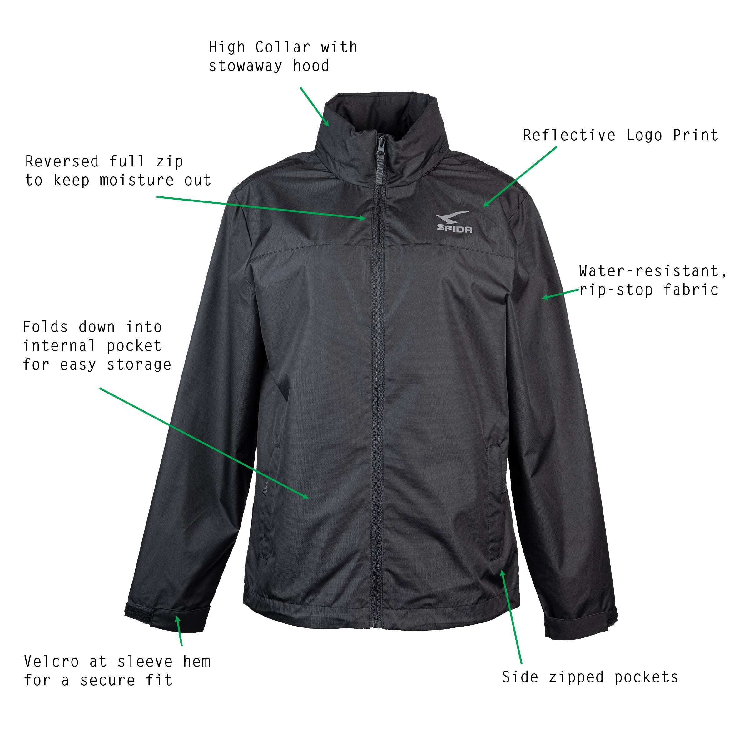 - High collar with stowaway hood